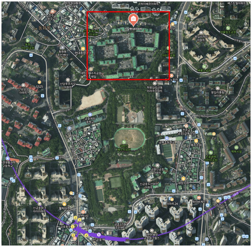 사진에 보이는 좌측 빨간 박스가 신당 현대아파트고, 사진 중앙 육교처럼 보이는 입구가 단지 입구이다. (처음에 입구 위에 육교?가 있어서.. 뭐지..? 했음..)